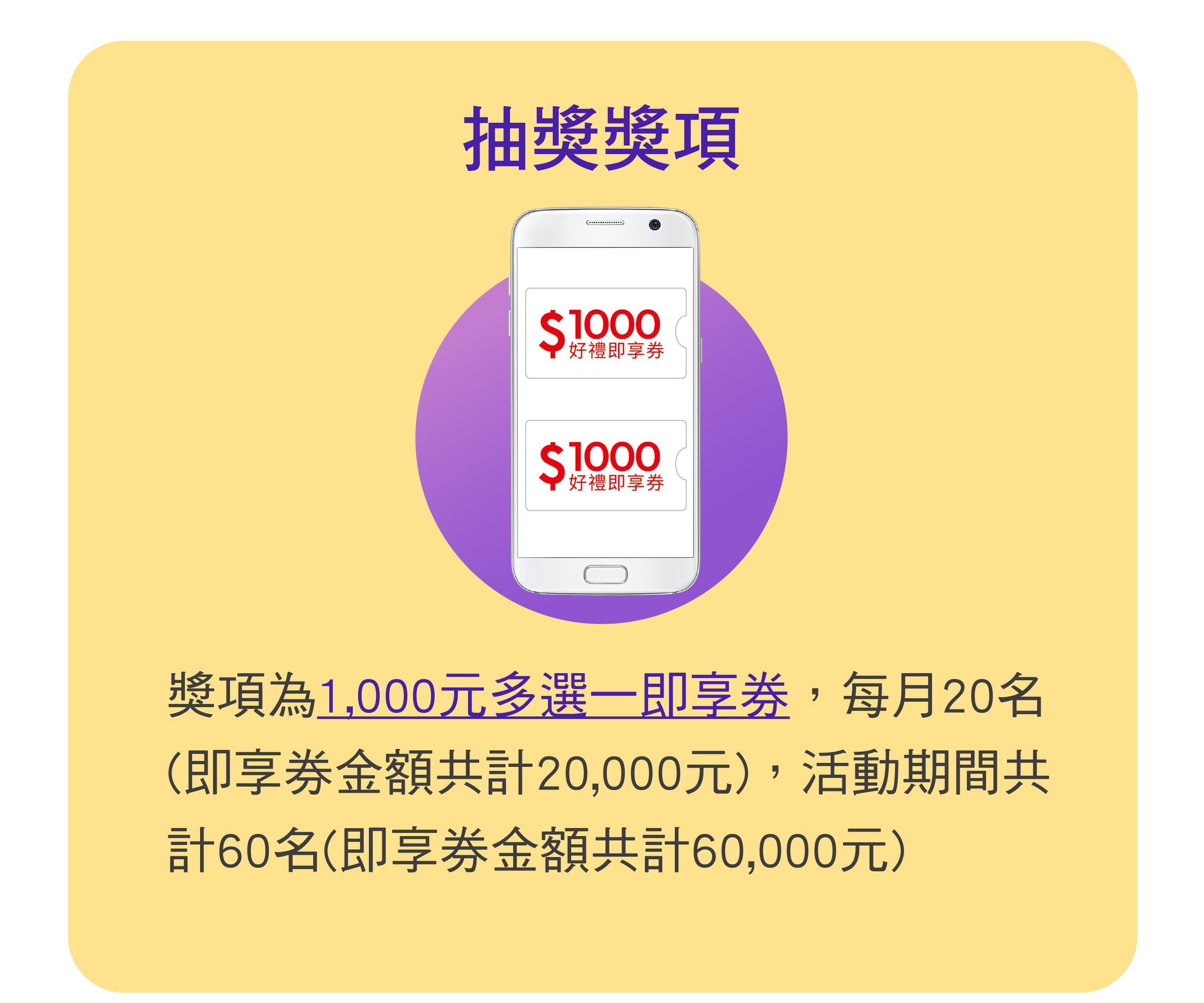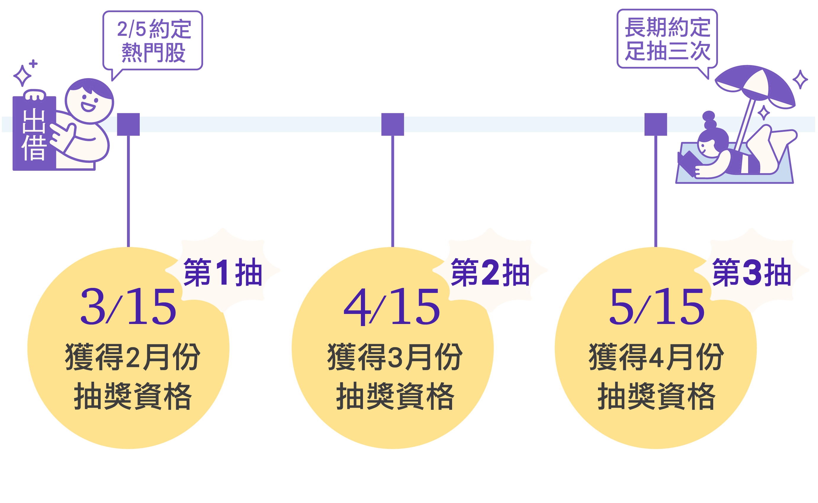 抽獎時程 | 活動期間為2至4月,每月一抽,總共抽 3 次。 |