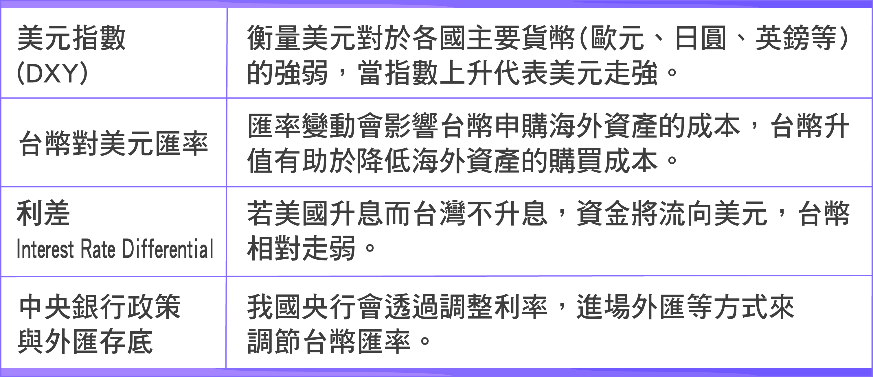 投資人若能掌握以下匯率指標與數據,可以更好地掌握投資時機,調節投資策略,避免匯率對獲利的侵蝕,甚至有機會可以獲取未來匯差收益。