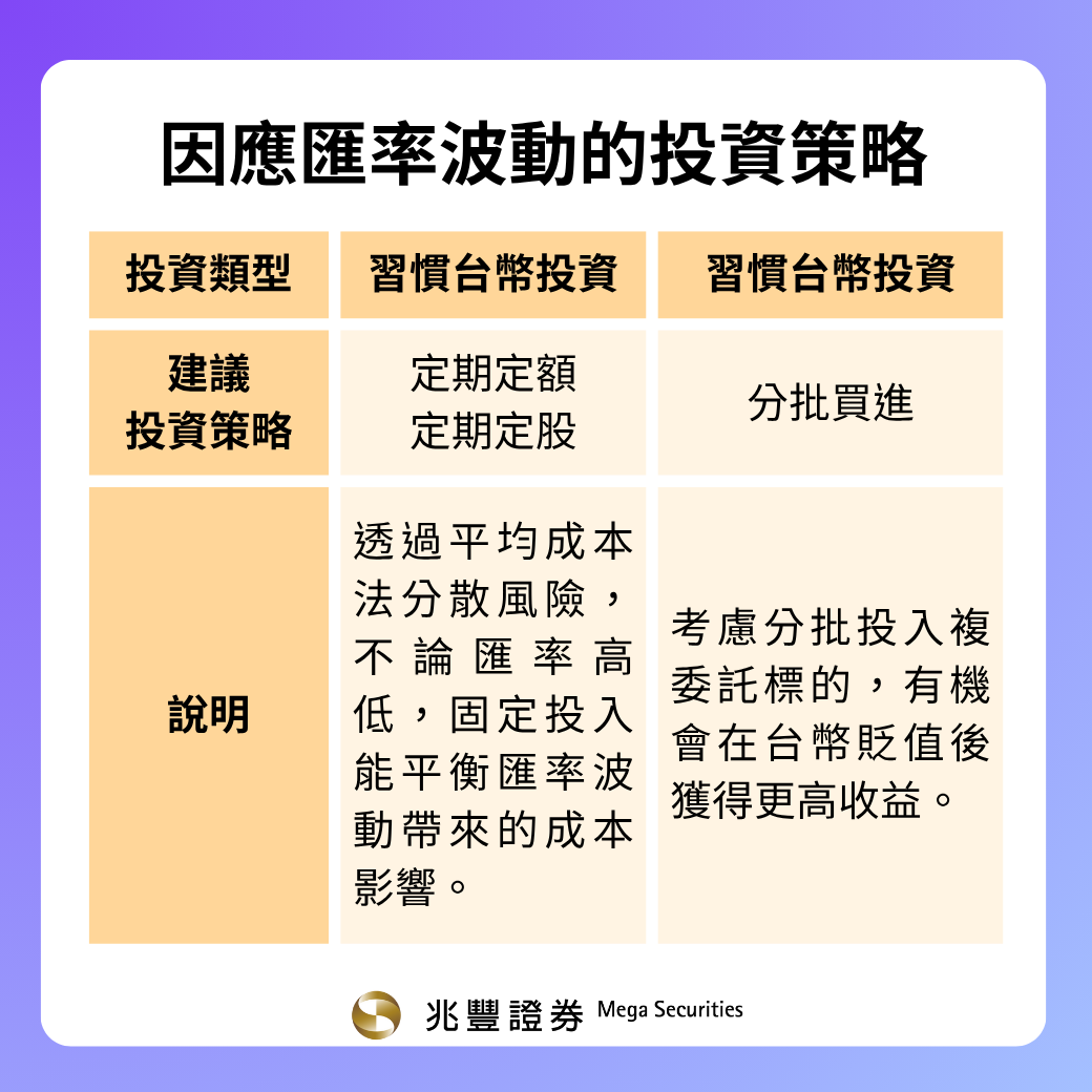 海外投資不僅僅是考慮投資標的本身的表現,匯率變動更是不可忽視的隱形成本。定期檢視匯率走勢、適時調整投資策略,能幫助投資人更好地管理風險並提升收益。善用兆豐證券e存股複委託定期定股、定期定額、每股購以及兆好Bond,進行分批買進策略,能有效分散成本,讓匯率波動成為你的投資優勢,而非風險。