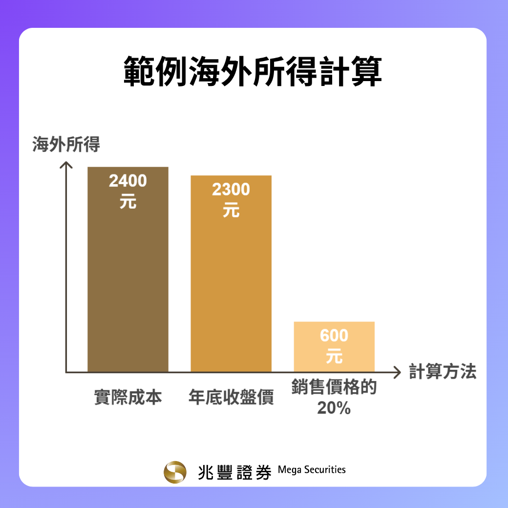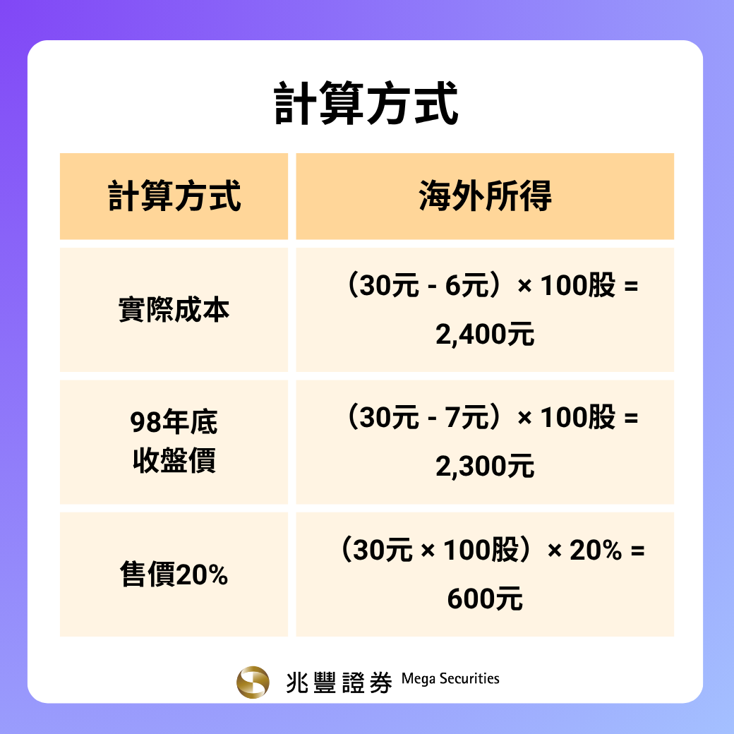 如果當我們處分(出售)海外有價證券時,若無法舉證實際成本費用,則可依照規定,若為處分有價證券時,可按實際成交價之20%計算海外所得