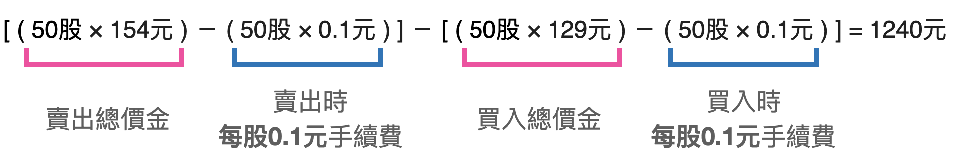 小明使用兆豐證券複委託帳戶採「美股每股」計算手續費的方式, 於112年1月6日買入美股 – 蘋果(AAPL)100股,每股129元,於112年2月3日賣出50股,每股154元,這筆投資的海外所得如何計算?