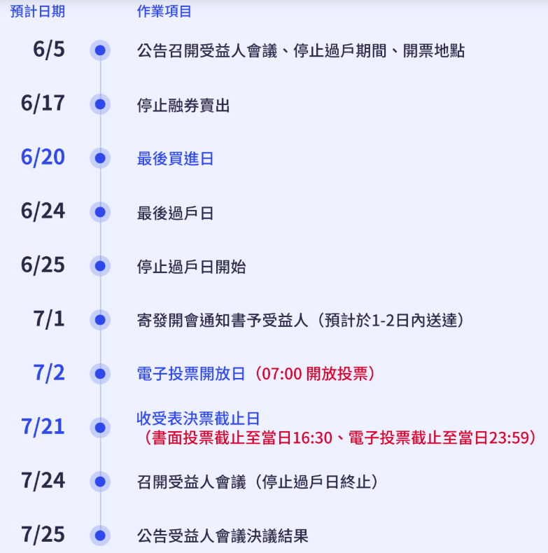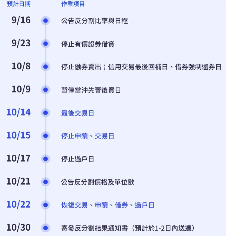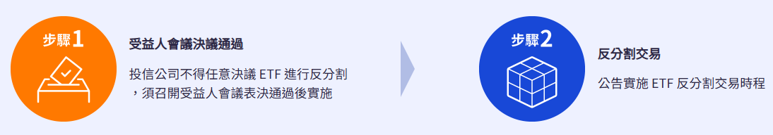 資料來源:臺灣證券交易所、元大投信。實際時程可能視情況調整,如有變動將揭露於元大投信公司官網(www.yuantafunds.com)、公開資訊觀測站(mops.twse.com.tw/mops/web/index)及期信基金資訊觀測站(www.fundclear.com.tw)。ETF進行反分割不影響投資人持有的基金資產總價值,須留意相關作業將暫停初級市場申購贖回、次級市場買賣與轉換,持有受益憑證之投資人於此期間無法進行任何交易。反分割議案是否通過,須經持有代表已發行受益憑證之受益權單位總數1/2以上的受益人出席,並經出席受益人的表決權總數1/2以上同意。ETF進行反分割可能產生未滿一個受益權單位數之畸零受益權單位數,將於反分割後以現金返還投資人。