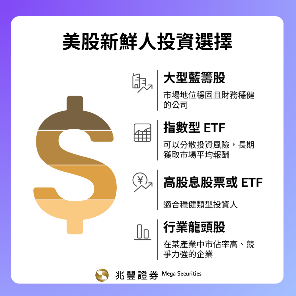 對於剛接觸美股的投資人,可以選擇先從以下幾種類型標的開始投資: