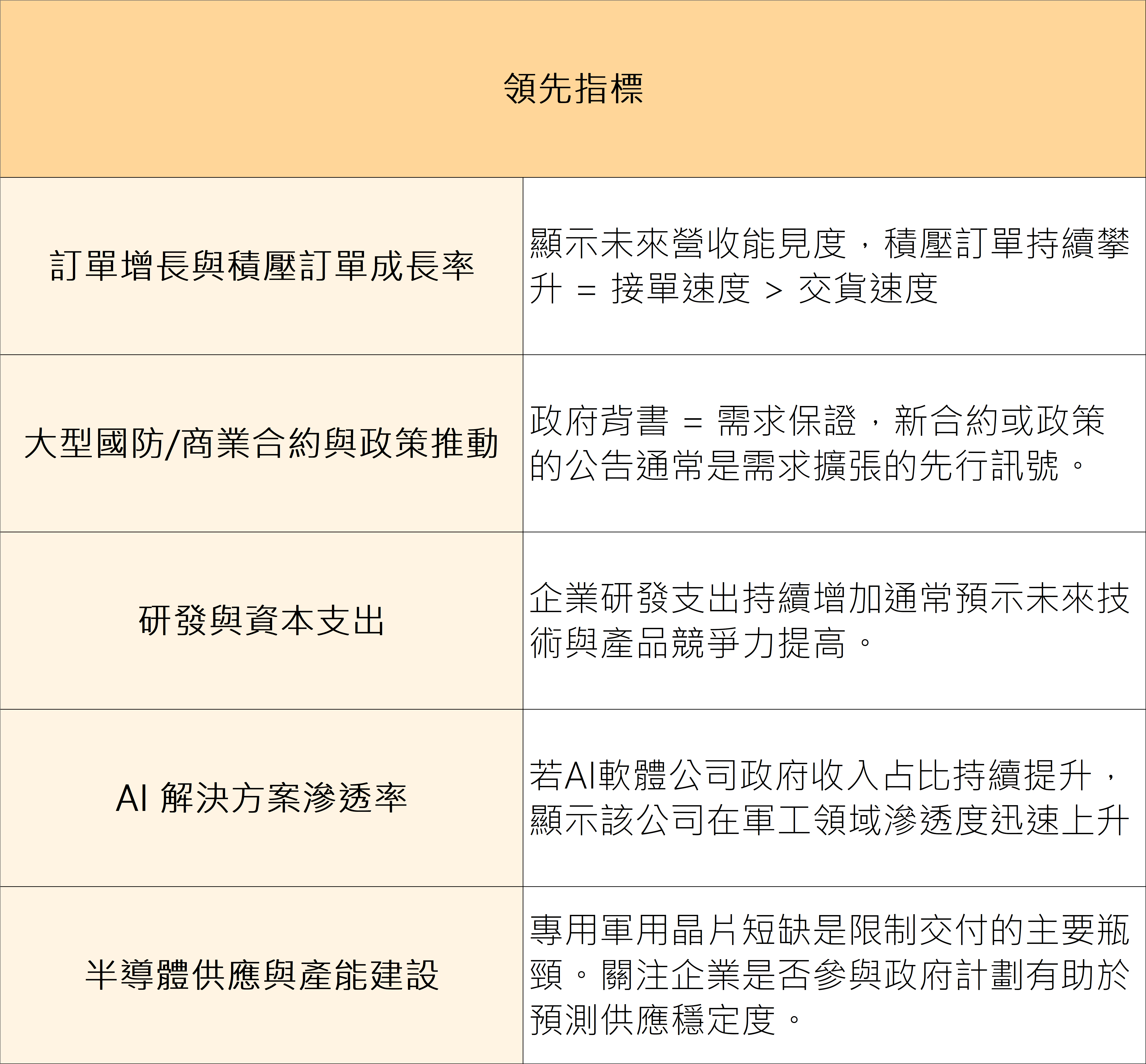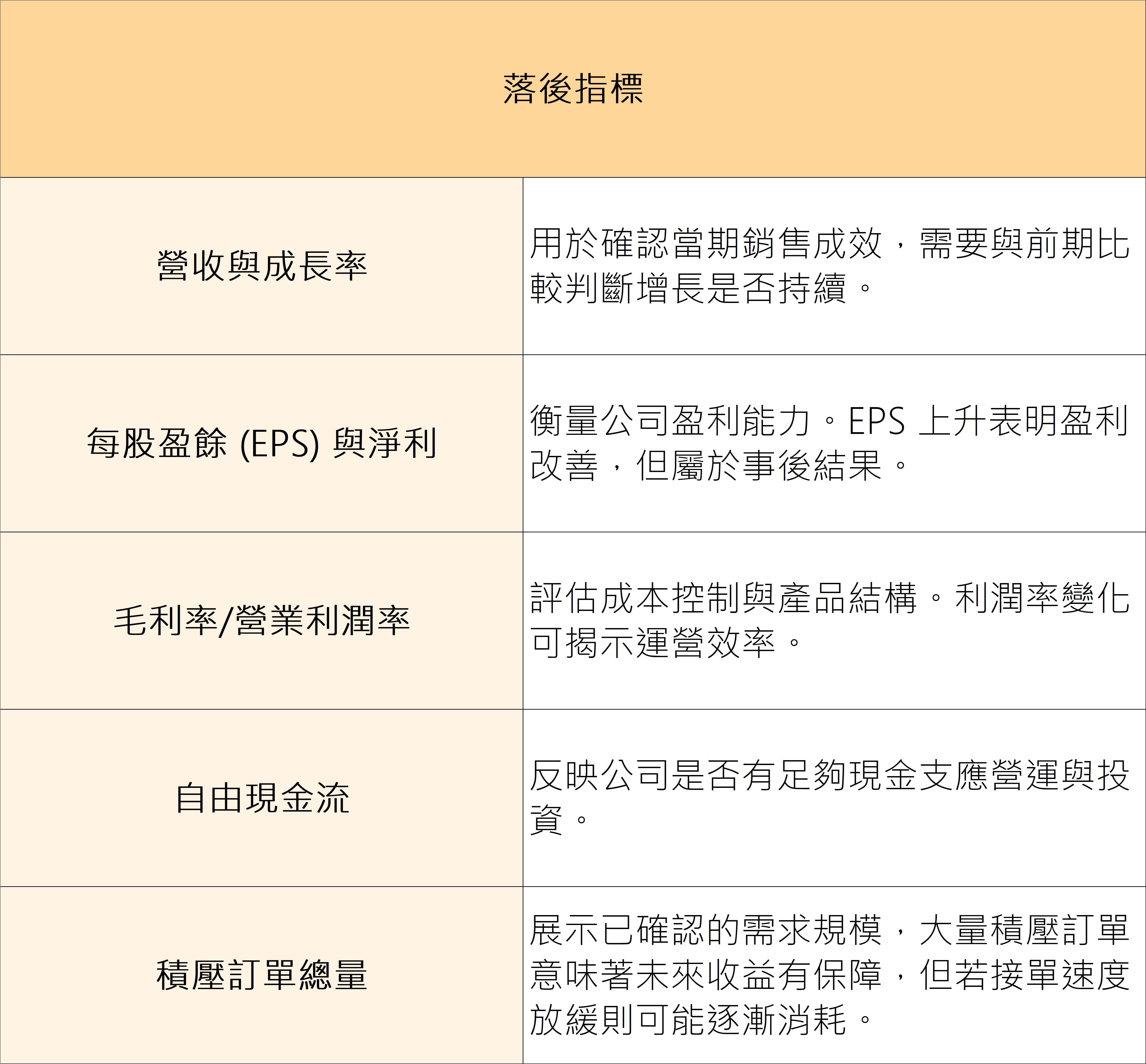 領先指標通常能預示公司未來的成長趨勢和現金流;落後指標則反映過去的營運績效,確認現有基礎。以下表格列出兩類指標及簡要說明: