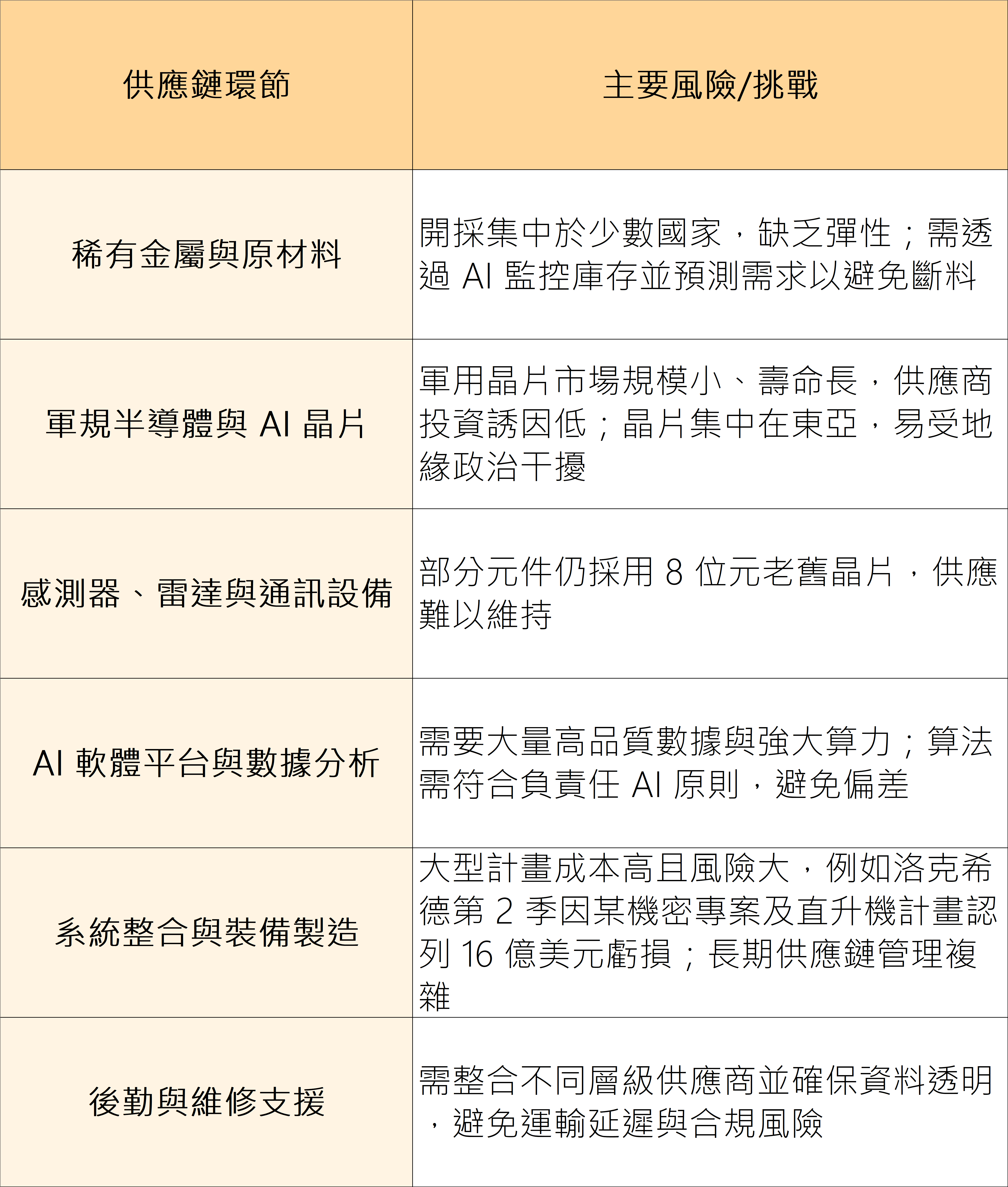 AI軍工產業的供應鏈複雜且多元,涉及軟體、硬體、數據和服務等多個環節。以下是主要的供應鏈組成;關鍵環節與主要挑戰: