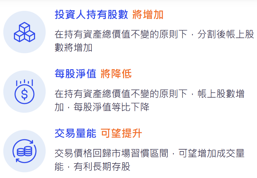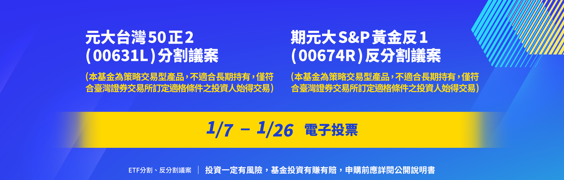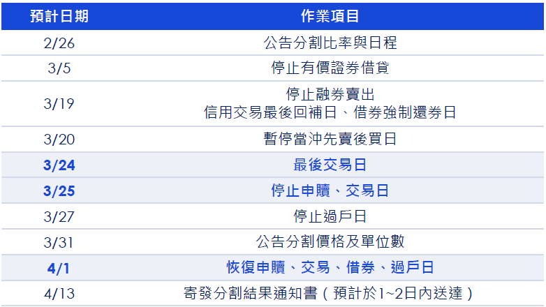 資料來源:臺灣證券交易所、元大投信。實際時程可能視情況調整,如有變動將揭露於元大投信公司官網(www.yuantafunds.com)、公開資訊觀測站(mops.twse.com.tw/mops/web/index)及期信基金資訊觀測站(www.fundclear.com.tw)。ETF進行分割不影響投資人持有的基金資產總價值,須留意相關作業將暫停初級市場申購贖回、次級市場買賣與轉換,持有受益憑證之投資人於此期間無法進行任何交易。分割議案是否通過,須經持有代表已發行受益憑證之受益權單位總數1/2以上的受益人出席,並經出席受益人的表決權總數1/2以上同意。