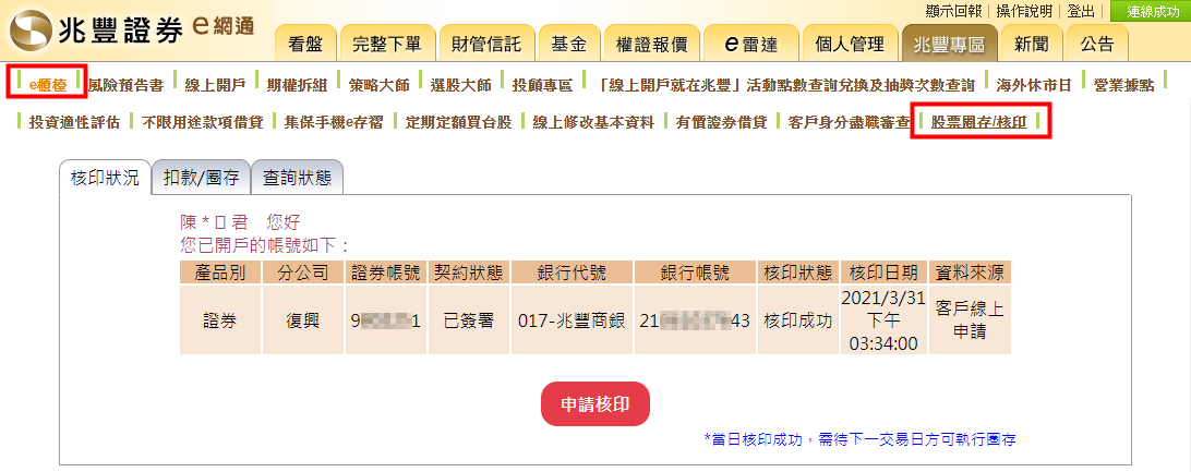 」,方能後續進行股票圈存或核印作業。