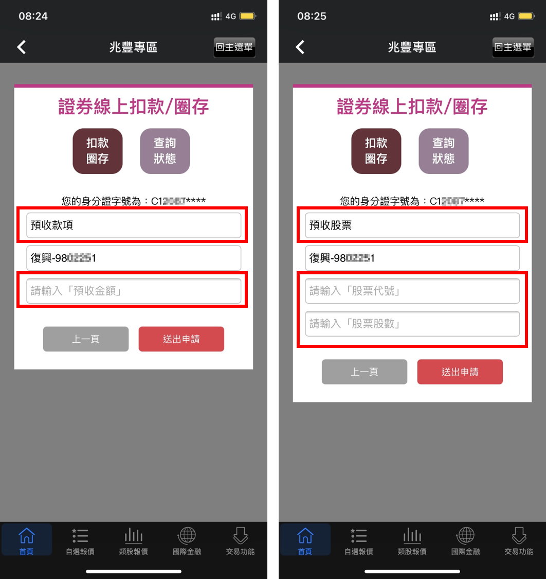 透過「兆豐專區」-E櫃檯,選取「股票圈存/核印」項目,通過核印後,於次一交易日即可自行在線上進行預收款項或股票圈存處理。