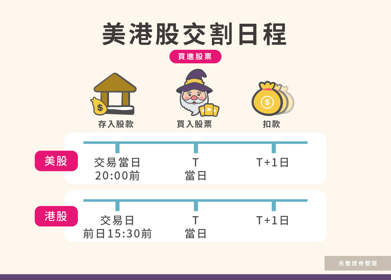 股票交割款項也需要投資人留意,透過複委託交易,款項是採取「圈存制」;買進時,帳戶內必須有足夠金額(含已賣出未入帳的股款)才能下單,款項圈存後就不能再動用。以美股與港股來說,買進實際扣款日為T+1日、賣出時的入帳日則為T+3日。