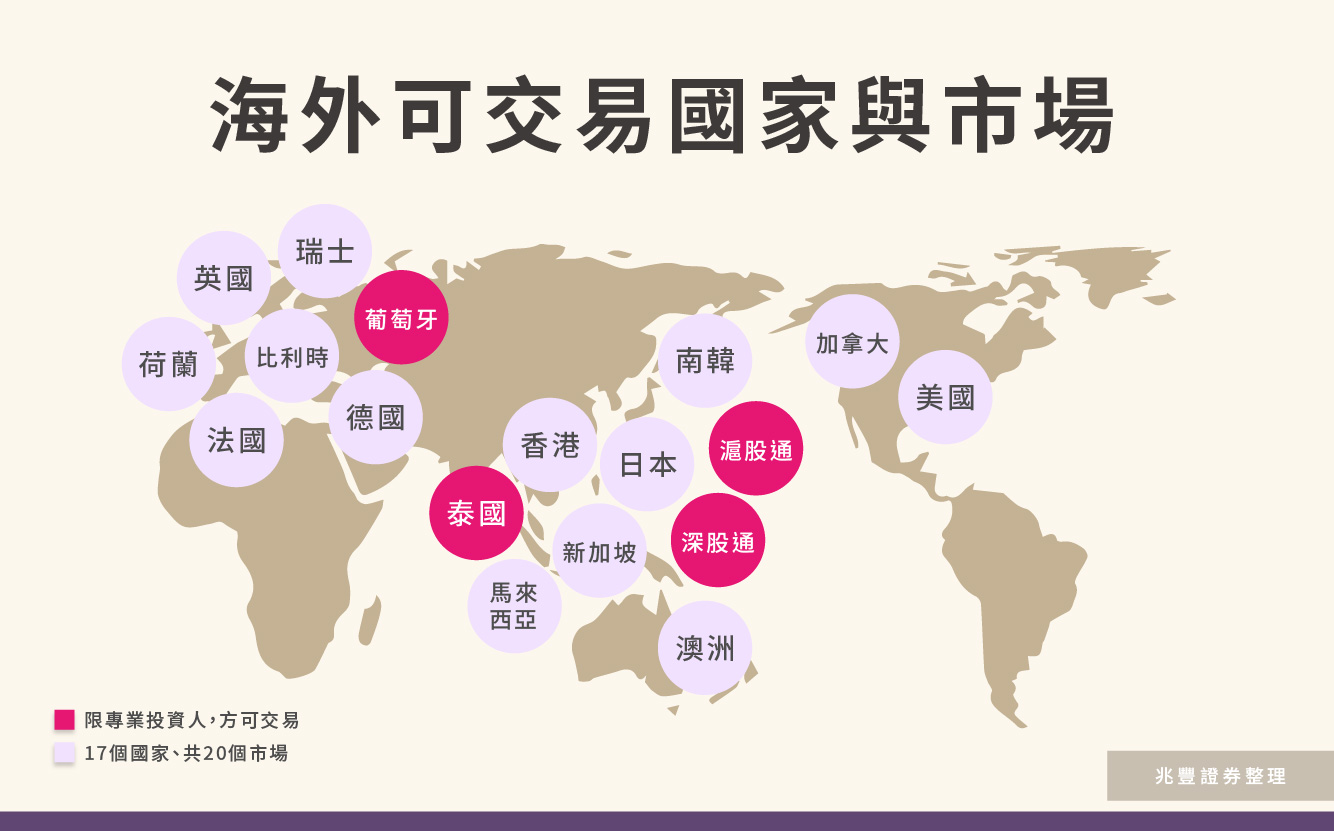 海外股市可以交易的市場不僅僅是常見的美股、港股,兆豐證券可交易的海外股票電子交易達17個國家、20個市場,可以滿足多數投資人的需求。請見下圖: