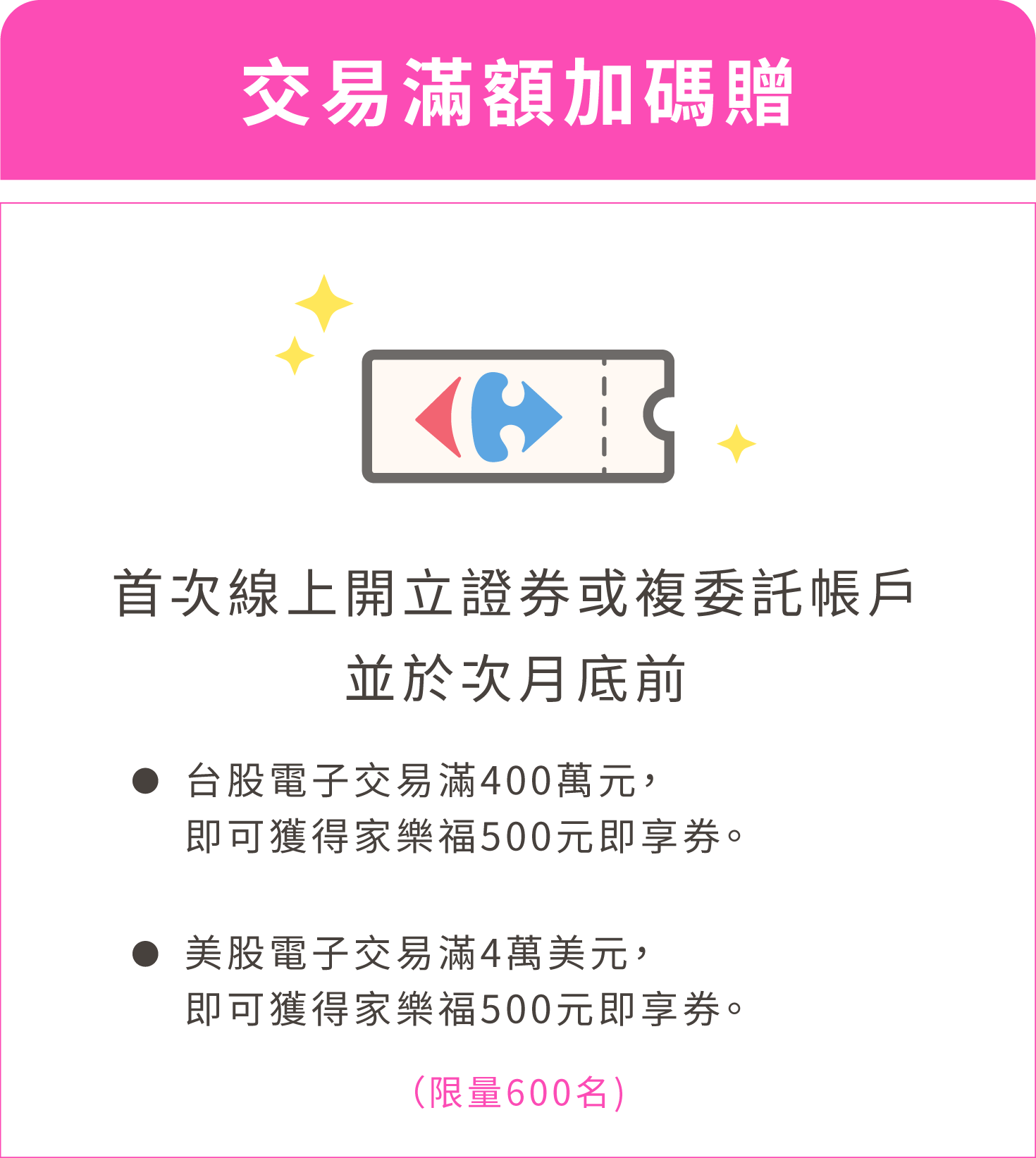 (2)交易滿額加碼贈:活動期間內,開戶當月至次月底前達成加碼活動條件,即可符合贈獎資格,限量前600名。若同日完成則以時間先後排序符合贈獎資格。