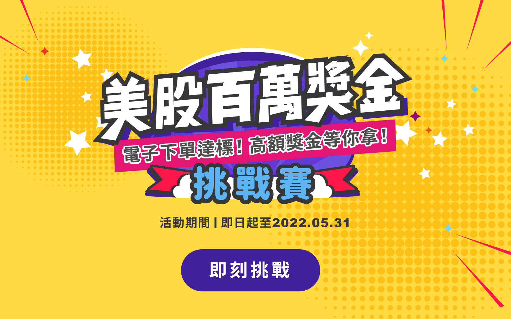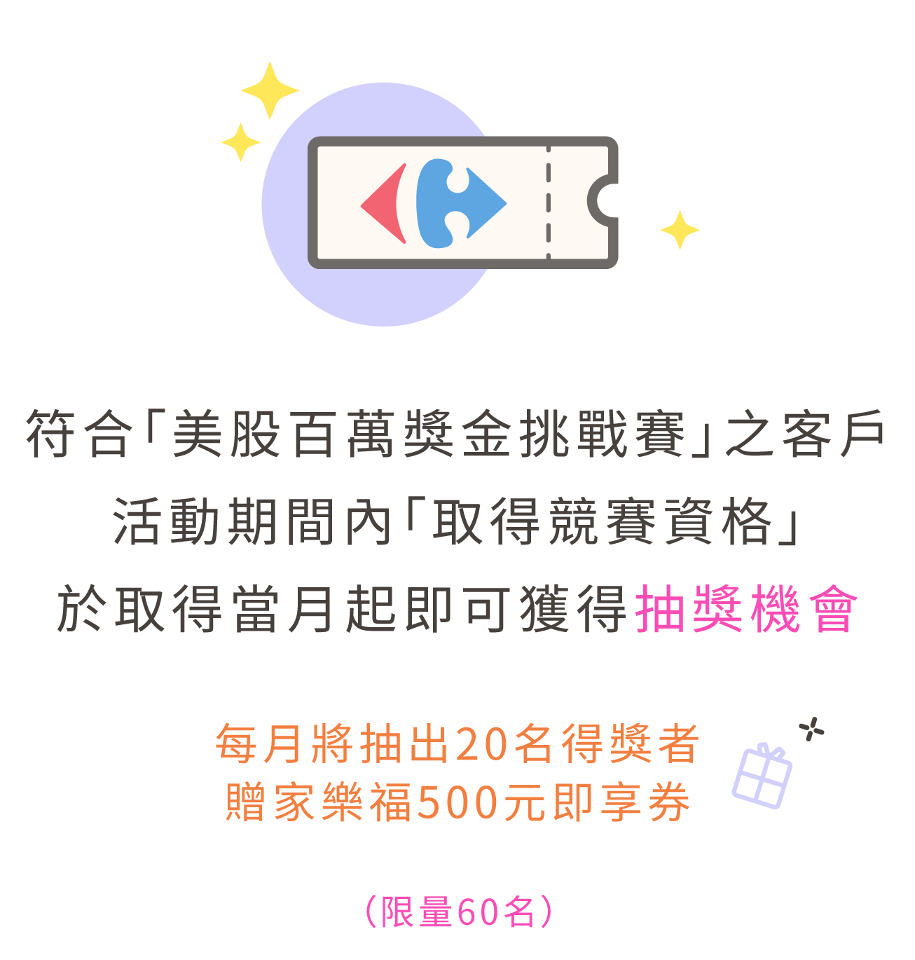 符合「美股百萬獎金挑戰賽」之客戶,活動期間內「取得競賽資格」,於取得當月起即可獲得抽獎機會。