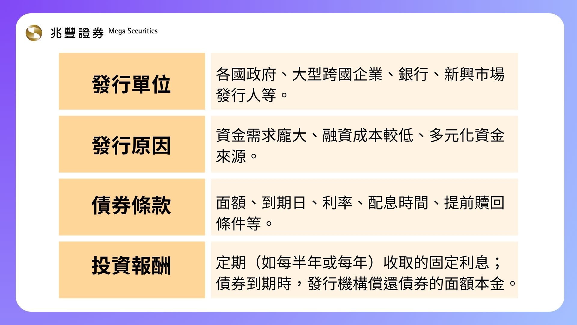 海外債券,顧名思義,就是由國外的政府、企業或金融機構所發行的債券,並在當地或國際市場上銷售給全球投資人。簡單來說,海外債券是企業或國家為了籌措資金,向國外投資人借錢的金融工具,投資人買進海外債券,就等於是把錢借給這些發行單位,並透過固定的利息或債券到期償還本金來獲得報酬。